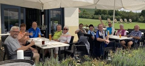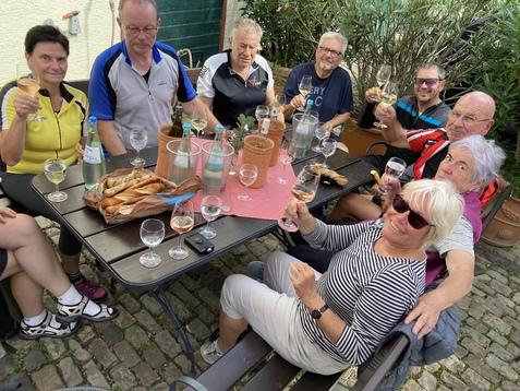 Ein Stopp im Eiscafé am Rhein in Nierstein markiert das nahende Ende der Tour. Ein letztes Mal über den Rhein, und um 17:30 Uhr findet auf der Bürgerhaus-Terrasse der Ausklang statt. Die Gruppe bedankt sich bei Carmen Haym für die perfekte Organisation und Führung dieser Tour bei bestem Wetter.